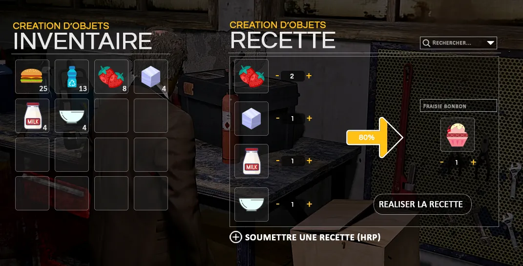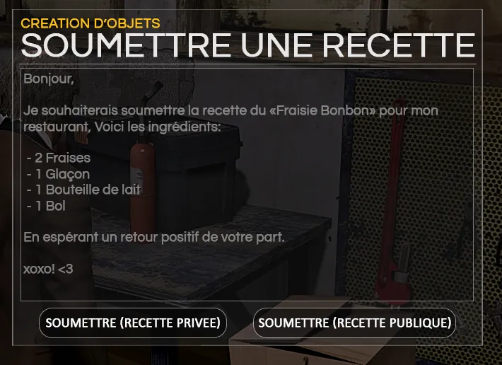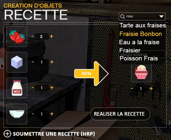 Les joueurs peuvent proposer leurs recettes directement depuis l'interface de création d'objets où via l'ouverture d'un ticket sur le panel joueur. Celles-ci seront réalisables après validation de l'équipe OptionRP.