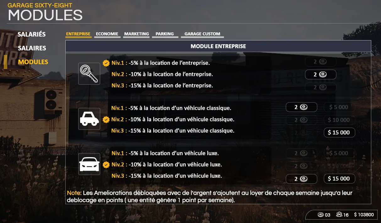 - Certains modules peuvent être débloquer avec de l'argent. La somme s'ajoute au loyer hebdomadaire de l'entreprise. Le seul moyen de ne plus payer la somme engagée est d'investir les points acquis avec le temps. Cela permet de rendre l'entreprise compétitive rapidement en échange d'une forte somme d'argent.