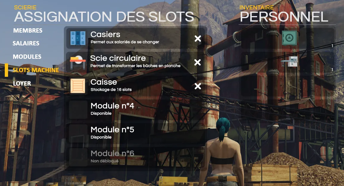 Un slot machine est un emplacement permettant d'installer de nouveaux équipements dans votre entreprise, il est accessible uniquement au patron.