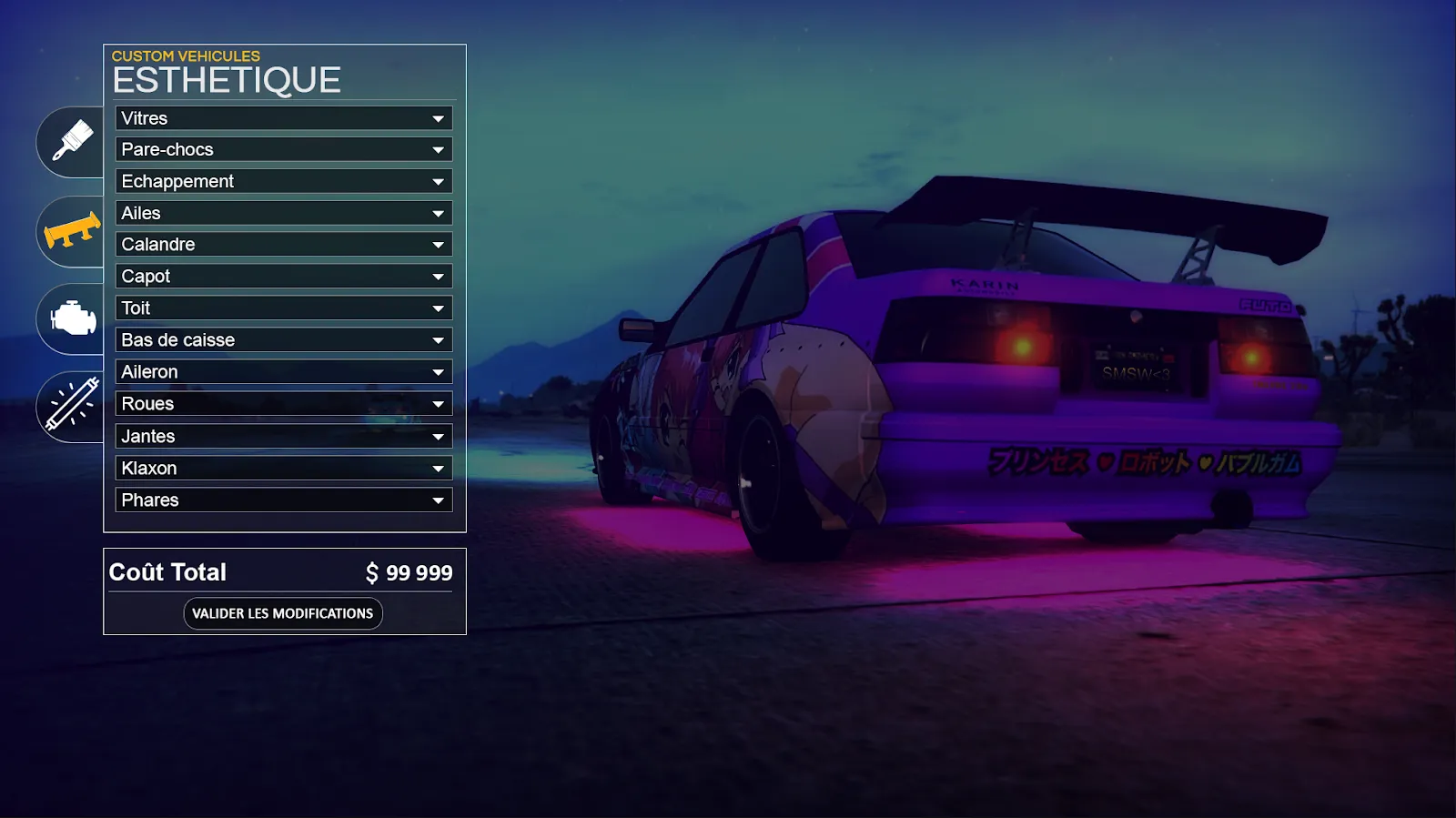Il est possible de customiser son véhicule par le biais des garages custom (entreprises en jeu), les véhicules en cours de location ne sont pas éligibles au custom.