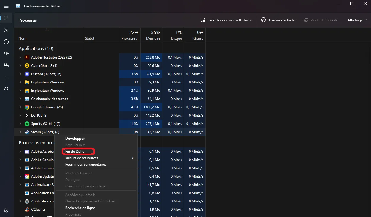 - Si la version steam reste bloquée sur “Load alt:V Client” , essayez de faire une fin de tâche sur le processus Steam dans votre gestionnaire des tâches (CTRL + ALT + SUPR).