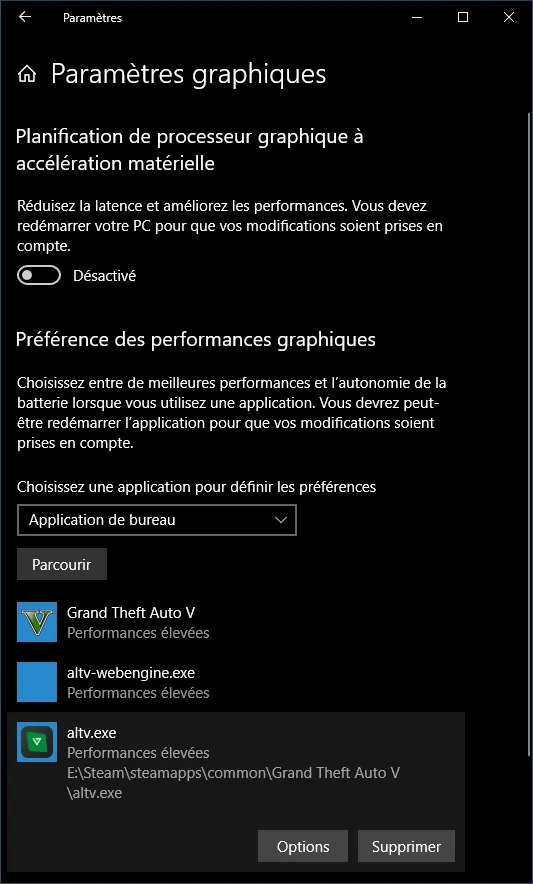 - Ajoutez les fichiers altv.exe, altv-webengine.exe et gta5.exe à la liste des applications et sélectionnez Performances élevées.