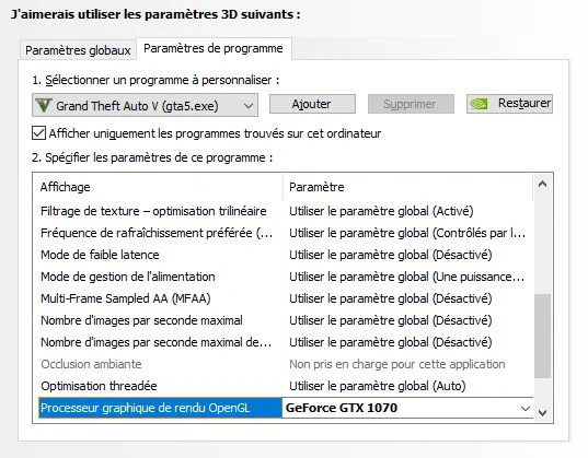 - Sélectionnez la même carte graphique pour le paramètre Processeur graphique de rendu OpenGL pour chacun des exécutables.
