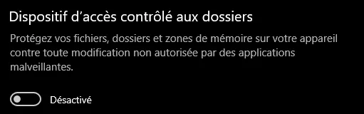 - Désactivez le dispositif d'accès contrôlé aux dossiers.