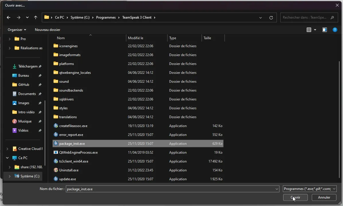 - Sélectionnez l'application Teamspeak 3 Package Installer. Si cette application n'est pas proposée, cliquez sur “choisir une autre application sur votre PC” et allez sélectionner le fichier situé à cet emplacement: C:\Program Files\TeamSpeak 3 Client\package_inst.exe
