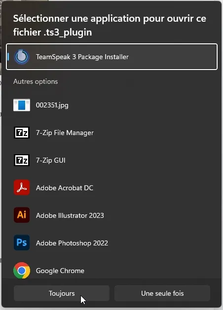 - Sélectionnez Teamspeak 3 Package Installer et cliquez sur le bouton toujours pour que les applications .ts3_plugin s'ouvrent directement avec cette application à l'avenir.