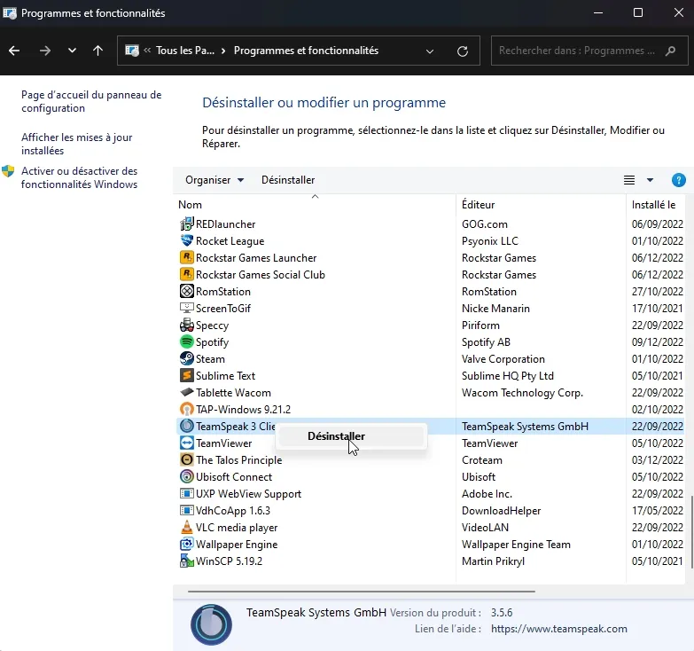 - Rendez-vous dans le panneau de configuration > Programmes et fonctionnalités puis faites un clic droit > désinstaller sur le logiciel Teamspeak 3 Client.